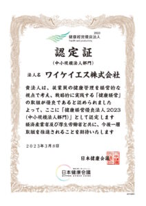 2023年3月9日 / 最終更新日時 : 2023年3月9日 yks-admin 「健康経営優良法人 2023」に認定されました。 以前から取り組んでおりました社員の健康管理が認められ、「健康経営優良法人 2023」に認定されました。 引続き、社員の健康管理に努め、健康に対する意識向上に取り組んでまいります。