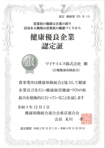2021年12月8日 / 最終更新日時 : 2021年12月8日 yks-admin 「健康優良企業 銀の認定」が更新されました。 当社は健康保険組合連合会東京連合会から、健康づくりの取り組みが評価され、2021年12月1日付けで「健康優良企業 銀の認定」が更新されました。 今後も継続して、健康づくりのための職場環境整備と社員の健康に対する意識向上に取り組んでまいります。